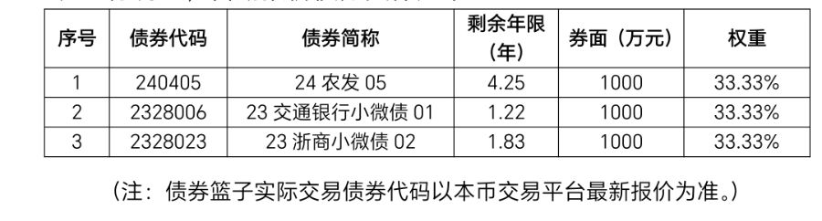 该债券篮子交易单位为3000万元,组合内精选3只银行间债券,且每只债券的权重均为33.33%,确保投资组合的均衡性。组合内的债券将根据指数追踪情况进行适时调整,以优化投资效果。首期报价债券的具体情况如下: