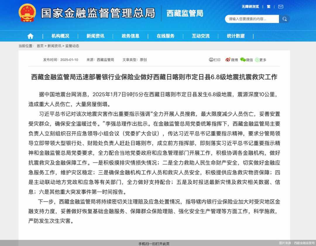 西藏日喀则6.8级地震,金融监管局紧急部署抗震救灾