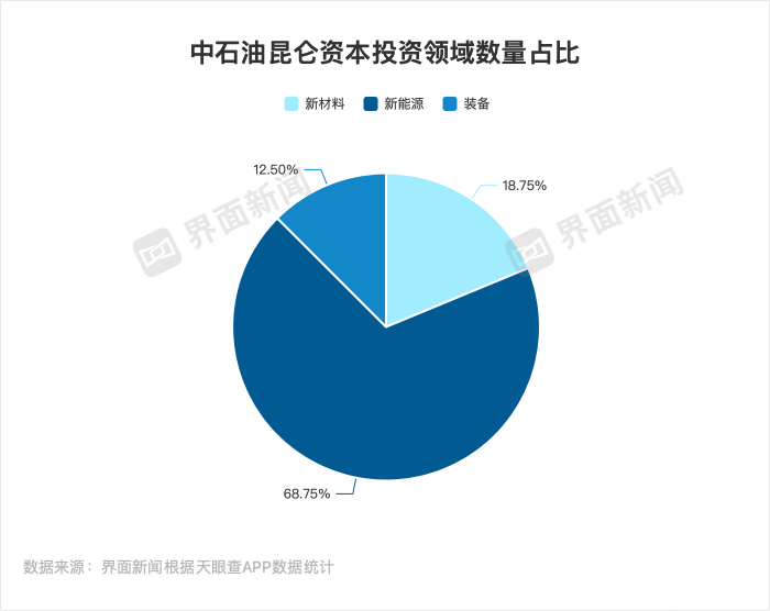 与中石化资本相比,中石油昆仑资本在对外投资数量上稍逊一筹。昆仑资本成立于2021年,注册资本100亿元,由中国石油天然气集团有限公司持股51%。截至2024年1月10日,昆仑资本公开投资事件共计16次,涉及新能源、新技术和高端装备等,其中新材料和新能源领域的投资占比超过八成。其投资的企业包括聚变新能源(安徽)有限公司、领充新能源、上海玖行能源科技公司等。
