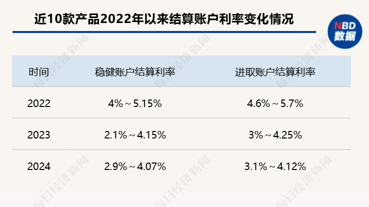 在披露2024年结算利率的约20款产品中,有16款产品的进取账户表现好于稳健账户,占比达80%。然而,也有少数产品的稳健账户表现更佳,如人保寿险福寿年年专属商业养老保险的稳健账户结算利率高于进取账户。此外,国民养老和新华养老等两家公司的结算利率水平较高,均达到了4%以上。
