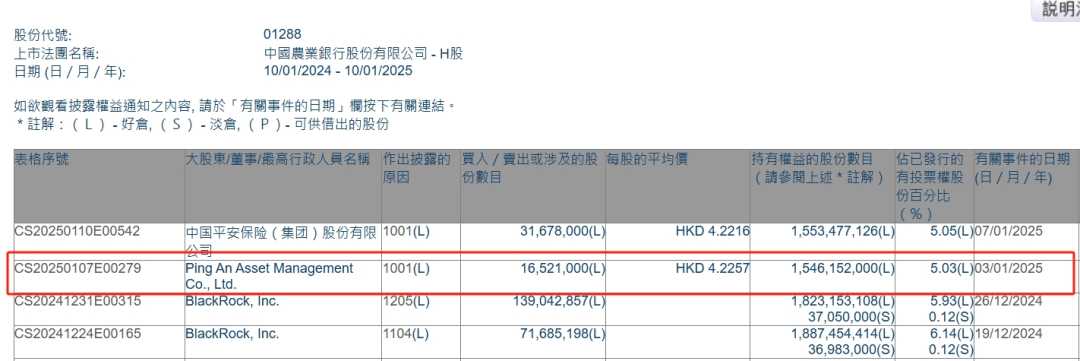 此外,中国平安旗下平安资管也于1月3日以每股平均价4.2257港元购入农业银行H股16,521,000股,耗资约6977万港元,持股比例由4.97%增至5.03%。这是中国平安和平安资管首次披露持有农业银行H股比例超过5%。