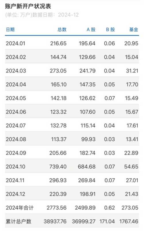 从整体数据来看,去年四季度A股开户数创下了新高。据上交所官网披露,2024年12月A股新增开户数为198.9万户,环比增长-26%,同比增长75%。全年新增开户数更是达到了约2500万户,同比增长17%。