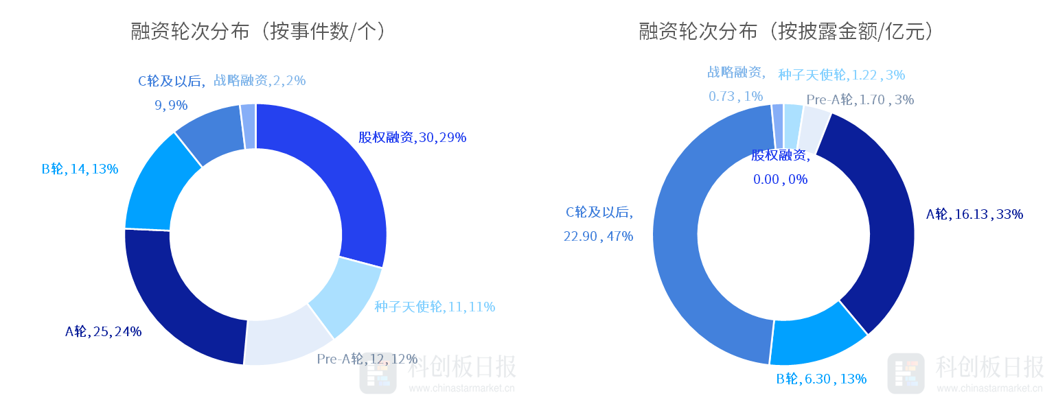 本周,A轮融资事件数最多,达到25起,占比约24%;B轮融资事件紧随其后,共发生14起,占比约13%。从各轮次获投金额来看,C轮及以后的融资总额最高,约为22.90亿元;A轮融资总额次之,约为16.13亿元。