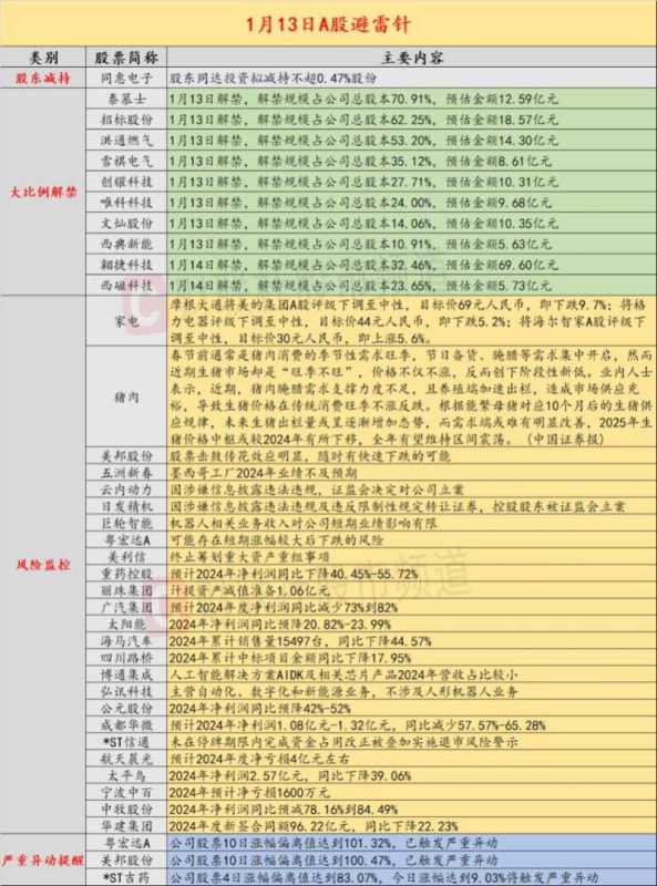 导读:财联社1月13日发布投资避雷针,A股及海外市场潜在风险事件如下。国内经济方面,国家卫健委称近期流感未超过去年水平;摩根大通下调中国家电企业评级。公司预警方面,美邦股份提示股价随时可能快速下跌;云内动力因涉嫌信息披露违法违规被证监会立案。海外市场,美国强劲就业数据导致美股收跌;国际油价受多重因素影响大涨。