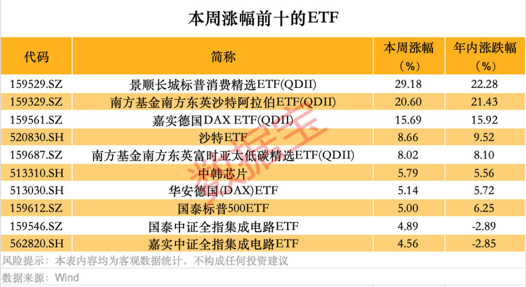 尽管整体市场表现不佳,但跨境ETF却成为本周的亮点。数据显示,包括景顺长城标普消费精选ETF(QDII)、南方基金南方东英沙特阿拉伯ETF(QDII)和嘉实德国DAX ETF(QDII)在内的多只跨境ETF涨幅超过15%,其中景顺长城标普消费精选ETF(QDII)更是大涨超29%,收盘价创出历史新高。该基金的前十大重仓股包括亚马逊、特斯拉等全球知名企业。