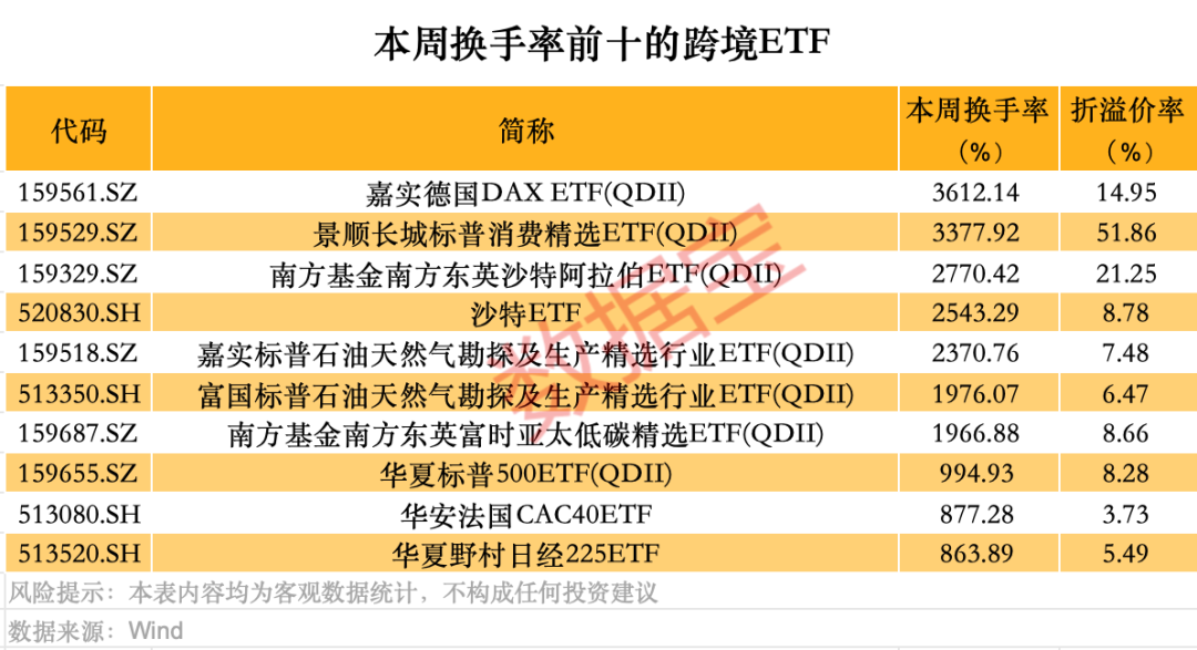 然而,跨境ETF的火爆也带来了超高换手率和溢价率的问题。数据显示,有7只跨境ETF近一周换手率超过10倍,平均溢价率高达13.69%。其中,景顺长城标普消费精选ETF(QDII)的溢价率更是高达51.86%。基金公司纷纷发布公告,提醒投资者注意高溢价风险。
