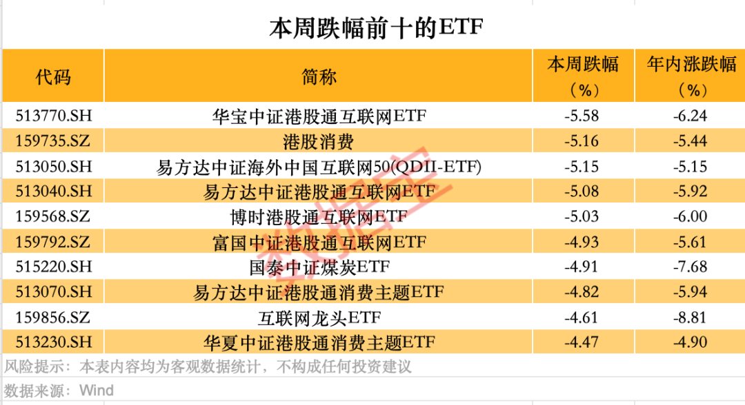 与此同时,中概股ETF及港股科网公司相关的ETF则大幅下跌。华宝中证港股通互联网ETF、港股消费、易方达中证海外中国互联网50(QDII-ETF)等近一周均跌超5%。其中,华宝中证港股通互联网ETF下跌5.58%,其前十大重仓股包括美团、腾讯等知名企业。