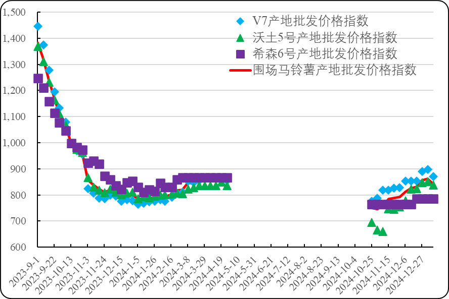 近期全国蔬菜价格平稳,围场马铃薯出货速度放缓,价格涨跌不一。初级薯制品价格受进口价格上涨影响波动上涨。预计春节前围场及全国初级薯制品出厂价格或将偏强运行。