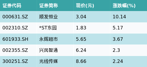 在参股民营银行主题下,表现各异的股票中,涨跌幅前五名分别为顺发恒业(000631.SZ)、*ST东园(002310.SZ)、永辉超市(601933.SH)、兴民智通(002355.SZ)与光线传媒(300251.SZ)。以下是详细的涨跌幅数据表格: