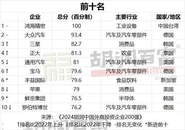 1月13日,胡润研究院正式揭晓了《2024胡润中国外商投资企业200强》榜单,此次为第三次发布该榜单,且规模首次由100强扩展至200强。榜单中,鸿海精密凭借1.1万亿元的中国销售额和超过45万名员工数,再度蝉联榜首;紧随其后的是大众汽车,销售额达7800亿元;三星成功超越苹果,跻身至前三甲,其后依次为正大、通用汽车、宝马、丰益国际、苹果、鲜京集团、罗伯特博世。