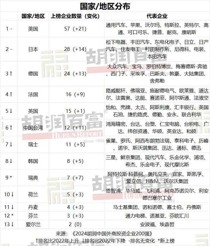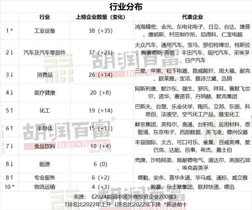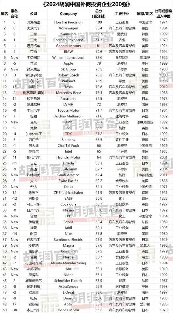 胡润研究院发布《2024胡润中国外商投资企业200强》榜单,鸿海精密蝉联榜首,200强企业在中国总销售额达10万亿元,美国企业上榜最多。