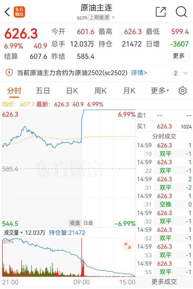 今日,国内商品期货市场收盘表现强劲,多数品种呈现上涨态势。其中,燃油与原油主力合约表现尤为突出,双双触及涨停板。截至收盘,国内原油主力合约SC2502大幅上涨6.99%,最终报收于626.3元/桶的高位。自去年12月中旬以来,该合约的累计涨幅已逼近20%,显示出市场对其未来走势的乐观预期。
