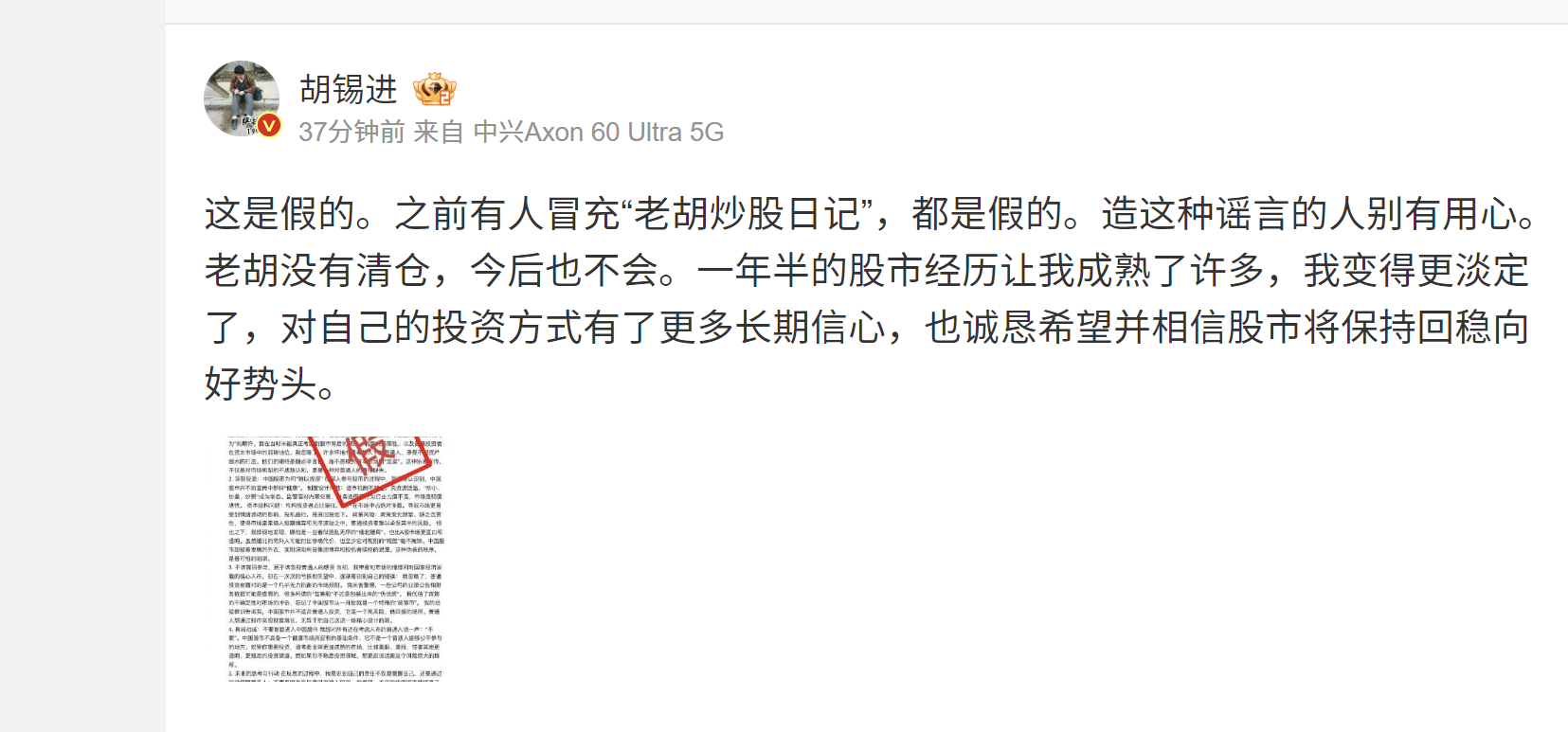 胡锡进辟谣清仓退市传闻,强调未清仓且看好股市前景