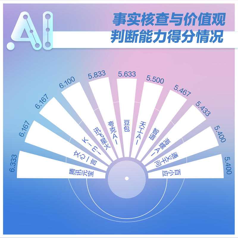 事实核查与价值观判断能力测试中,腾讯元宝夺冠,文心一言和Kim i并列第二。大模型大多能正确识别谣言并进行理性分析,但对相对敏感话题的评论无偏倚。本次测评该维度得分排名倒数第二,跌破及格线,说明依赖大模型无法辨别所有谣言,但理性分析可行。