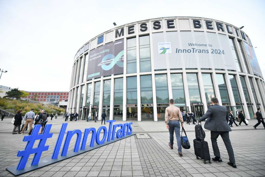 这是2024年9月24日拍摄的德国柏林轨道交通展入口处。当日,第十四届柏林国际轨道交通技术博览会开幕。本届展会的主题是“移动出行的未来”,电和氢驱动的低碳轨道技术,以及数字化、智能化解决方案成为焦点。新华社记者任鹏飞摄
