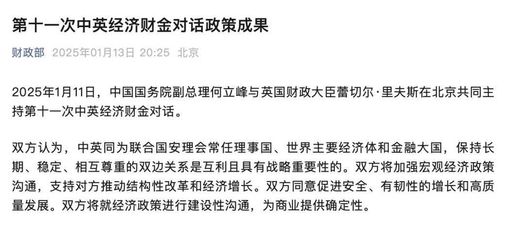 中英经济财金对话时隔近6年重启,公布了69项政策成果,涵盖宏观经济、金融改革、贸易投资等多个领域,并在资本市场、资产管理上达成17项成果与共识,包括“中英通”成功实施、中英ETF互联互通等,展示了中英两国金融开放的持续深化和对外开放扩大的信号。