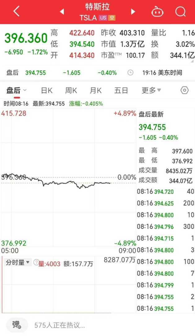 截至1月15日发稿时,特斯拉(TSLA)的美股在盘后交易中下跌了0.40%。