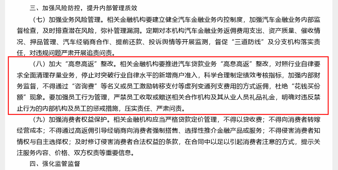 通知中,重庆金融监管局明确要求相关金融机构推进汽车贷款业务“高息高返”的整改工作,并要求全面清理存量业务。这是自去年传出“高息高返”被叫停的消息以来,首次有地方金融监管部门明确表态。此举旨在打击通过高额返佣等不正当竞争手段抢占市场份额的行为,鼓励金融机构通过提升服务质量来增强市场竞争力。