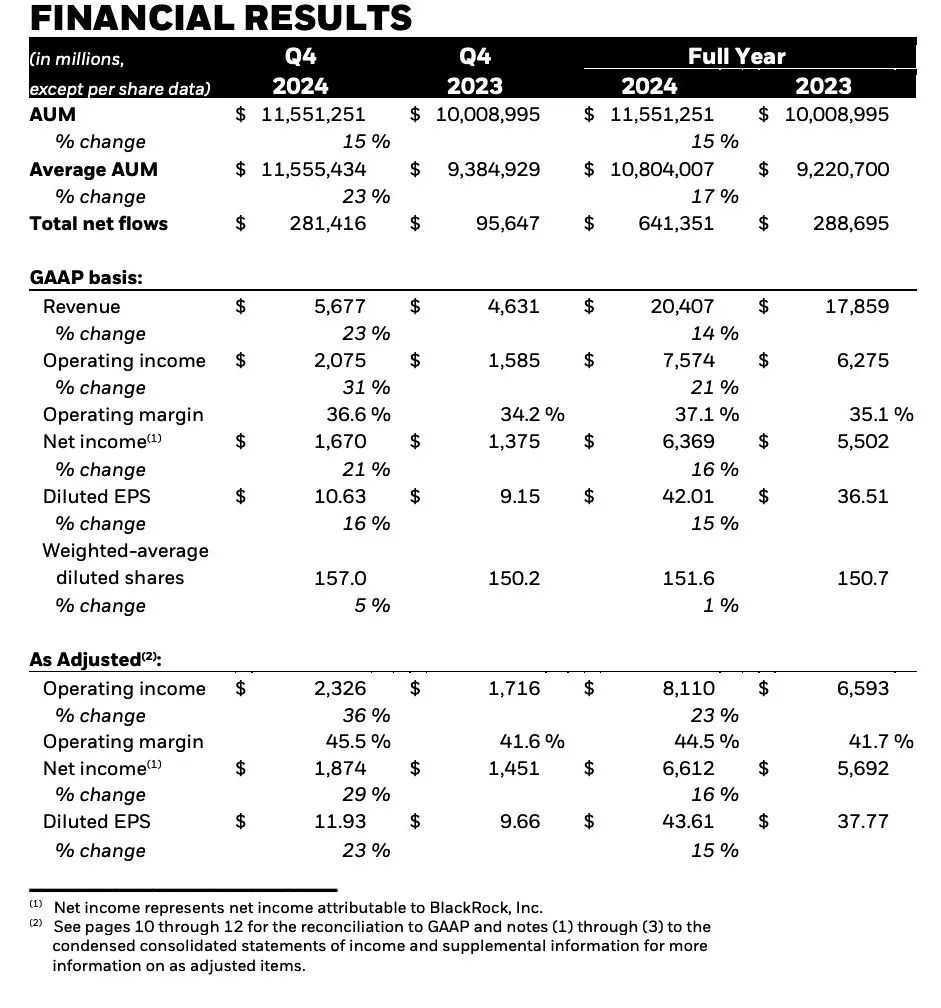 在财务表现方面,贝莱德集团2024年收入增长14%,这一增长主要由四大因素驱动:市场上涨带来的管理规模提升、有机增长带来的管理费收入增加、所收购资产产生的管理费收入、业绩费收入增长以及技术服务收入增长。同时,贝莱德营业利润也实现了21%的增长,经调整后更是达到了23%。