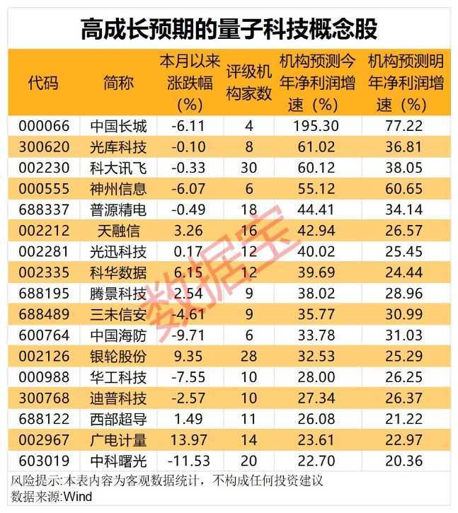 鉴于量子产业未来广阔的市场前景,部分个股的未来成长性备受期待。根据3家以上机构的一致预测,有17只股票在今明两年的净利增速有望超过20%,其中科大讯飞、普源精电、三未信安、光库科技、中国长城等机构的预测显示,这些股票的净利增速均将超过30%。