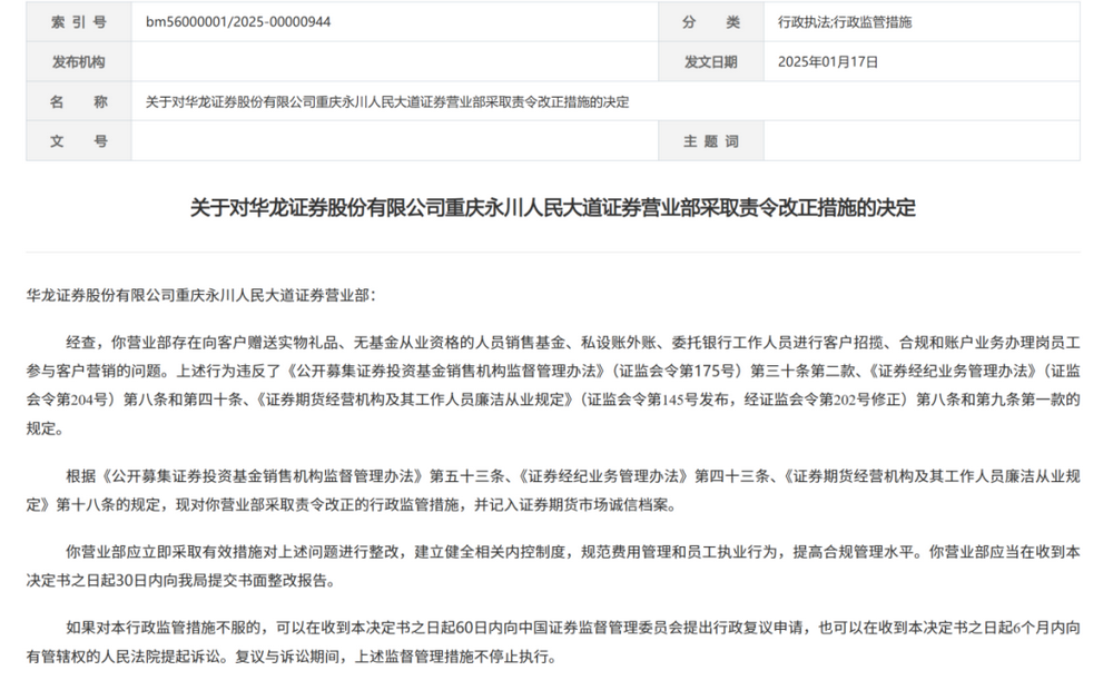 1月17日,华龙证券、中天证券、广发证券、华安证券以及华英证券等五家机构因业务违规被监管部门处罚。前一天,即1月16日,山东证监局也对兴业证券德州分公司的一名前从业人员进行了处罚。