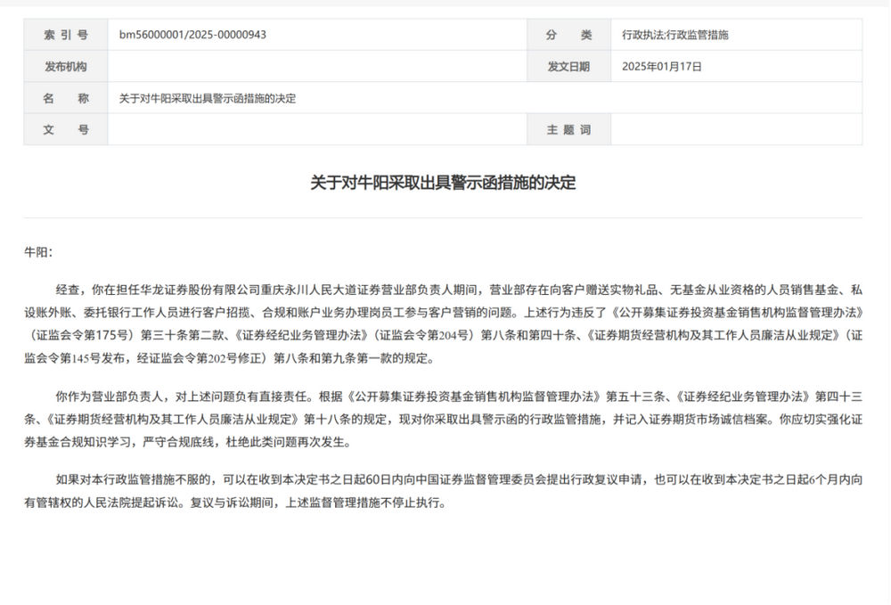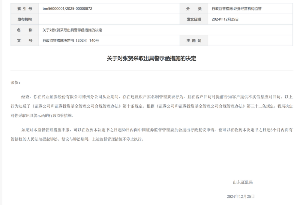 山东证监局披露的处罚公告显示,兴业证券德州分公司前员工张贺在从业期间违反账户实名制管理要求,并在客户回访时提前告知客户提供不实信息应对回访。山东证监局对张贺采取了出具警示函的行政监管措施。