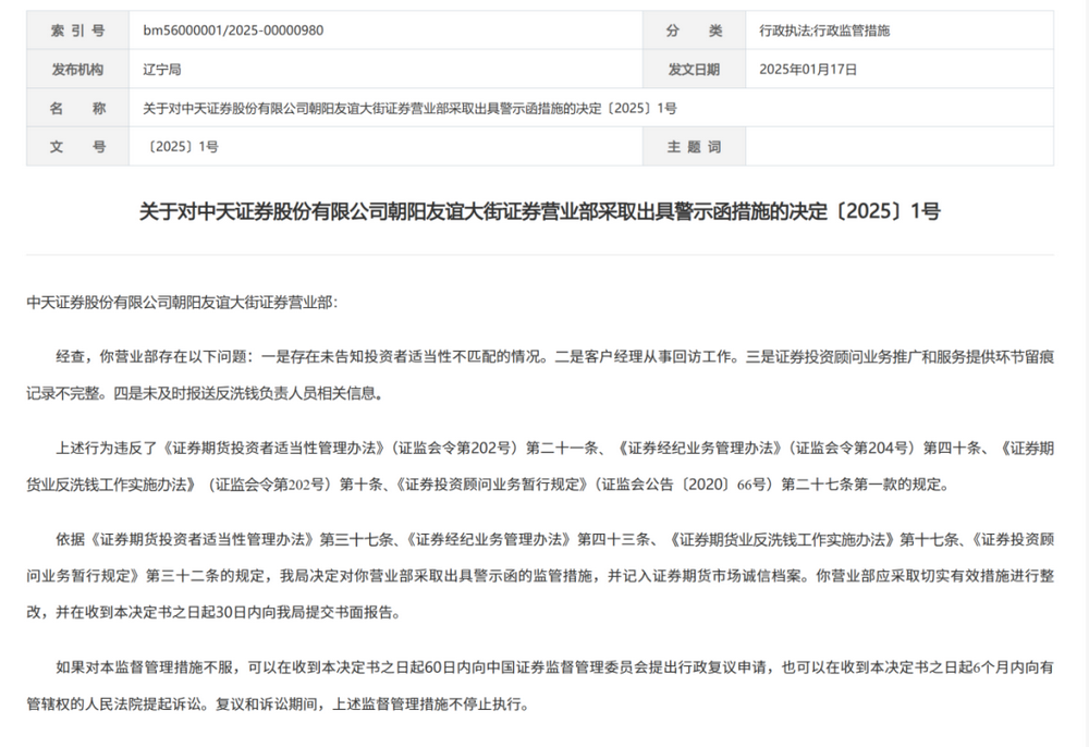 辽宁证监局披露的处罚公告显示,中天证券朝阳友谊大街证券营业部存在未告知投资者适当性不匹配、客户经理从事回访工作、证券投资顾问业务推广和服务提供环节留痕记录不完整以及未及时报送反洗钱负责人员相关信息等四项违规行为。辽宁证监局对该营业部采取了出具警示函的监管措施。