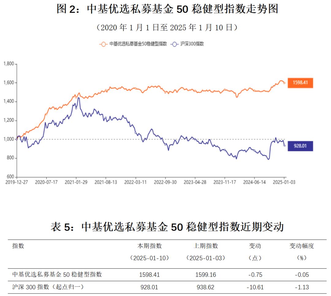 为满足追求长期稳健收益的投资需求,《中国基金报》于2021年6月4日发布了中基私募50稳健型指数。该指数秉承“全天候”理念,配置了股票多头基金、对冲基金、CTA基金三大类子基金,通过优选和配置,实现收益稳健。截至2025年1月10日,该指数收于1598.41点,当周下跌0.05%。