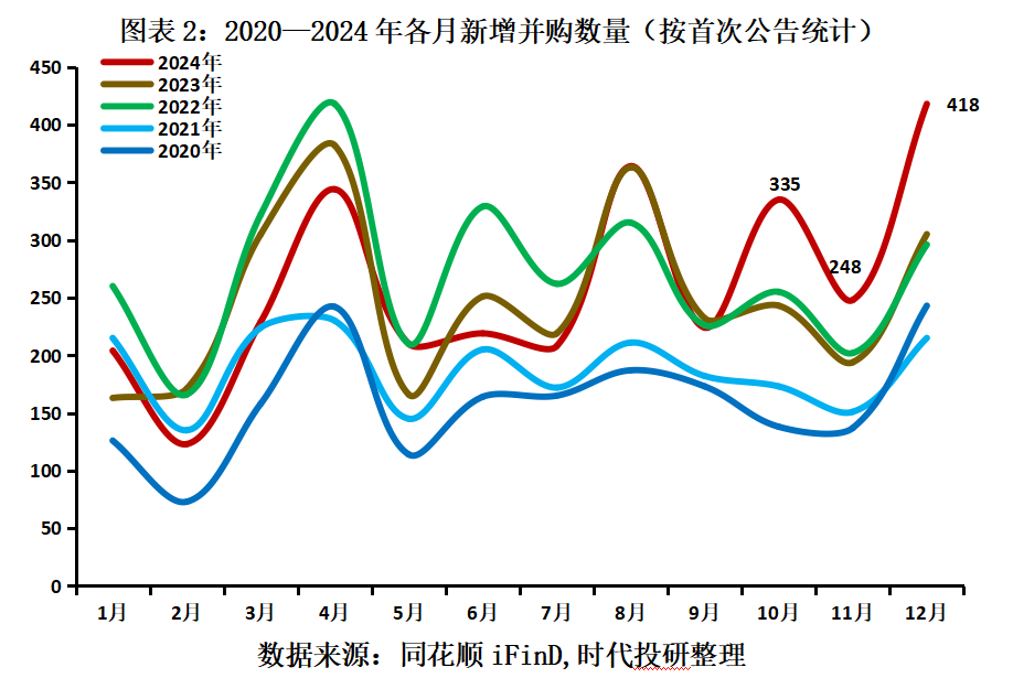 据数据统计,以首次公告为准,2024年第四季度,A股市场分别新增335起、248起、418起并购交易,单月新增并购数量均达到了过去五年的新高。