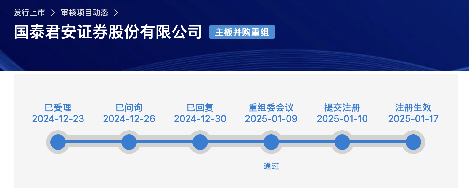 回顾此次国泰君安与海通证券的合并重组历程,两家公司于2024年9月5日同步发布了关于筹划重大资产重组的停牌公告。经过三个月的紧密筹备,2024年12月13日,两家公司成功召开股东大会,审议并通过了合并重组交易方案等相关议案。2024年12月23日,两家公司宣布合并重组申请已正式获得中国证监会及上交所的受理。2024年12月30日,两家公司披露了关于合并重组审核问询的回复报告,并详细公布了合并重组的大量关键细节。最终,在2025年1月9日晚间,国泰君安和海通证券发布公告,宣布本次合并重组已顺利获得上交所并购重组审核委员会的审核通过。