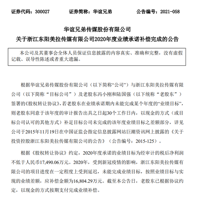 根据华谊兄弟与东阳美拉及老股东冯小刚和陆国强签署的《股权转让协议》,若老股东在业绩承诺期内未能完成某个年度的业绩目标,则需在审计报告出具之日起30个工作日内,以现金方式补足差额部分。2020年,受到新冠疫情的影响,东阳美拉的项目进度受到延迟,未能完成业绩目标,按照协议约定,应补偿金额为16,804.29万元。截至公告日,老股东已按期支付完成业绩补偿。