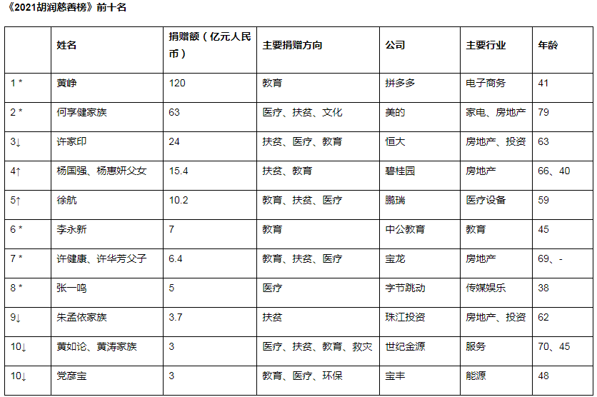 2021胡润慈善榜发布,中国亿级慈善家达到39人,拼多多创始人黄峥以120亿元捐赠额首次成为中国首善,捐赠主要用于支持科研、医疗、扶贫等领域。