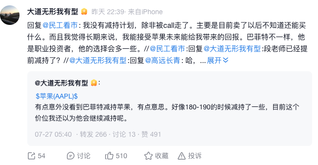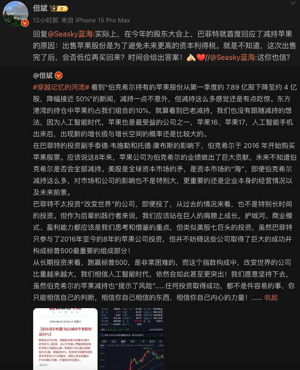 对于这一举动,段永平、但斌等投资界大佬纷纷发表看法。段永平在回复网友时表示,他没有减持苹果的计划,主要是目前卖了以后不知道还能买什么,而且他认为长期来说,苹果未来能带来的回报是可以接受的。但斌也表示,他看好苹果的长期发展前景,东方港湾的持仓中苹果约占组合的10%,即便看到巴菲特减持,他们也没有跟随减持的想法。