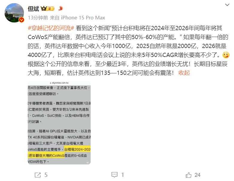 深圳东方港湾投资管理股份有限公司董事长但斌近日在微博上发表观点,指出台积电计划在2024年至2026年间每年将其CoWoS产能翻倍,英伟达已预订其中50%至60%的产能。基于这一公开信息,但斌认为英伟达至少在最近三年内业绩增长前景无忧,并预测英伟达股价在135美元至150美元之间可能会经历震荡。