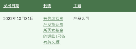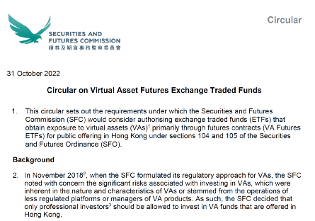 随后,香港证监会网站发布了《有关虚拟资产期货交易所买卖基金的通函》,详细阐述了认可虚拟资产期货ETF在香港公开发售的相关情况。该通函指出,香港证监会将考虑允许以虚拟资产为基础的ETF根据《香港证券及期货条例》主要通过期货合约的方式在香港公开发售。