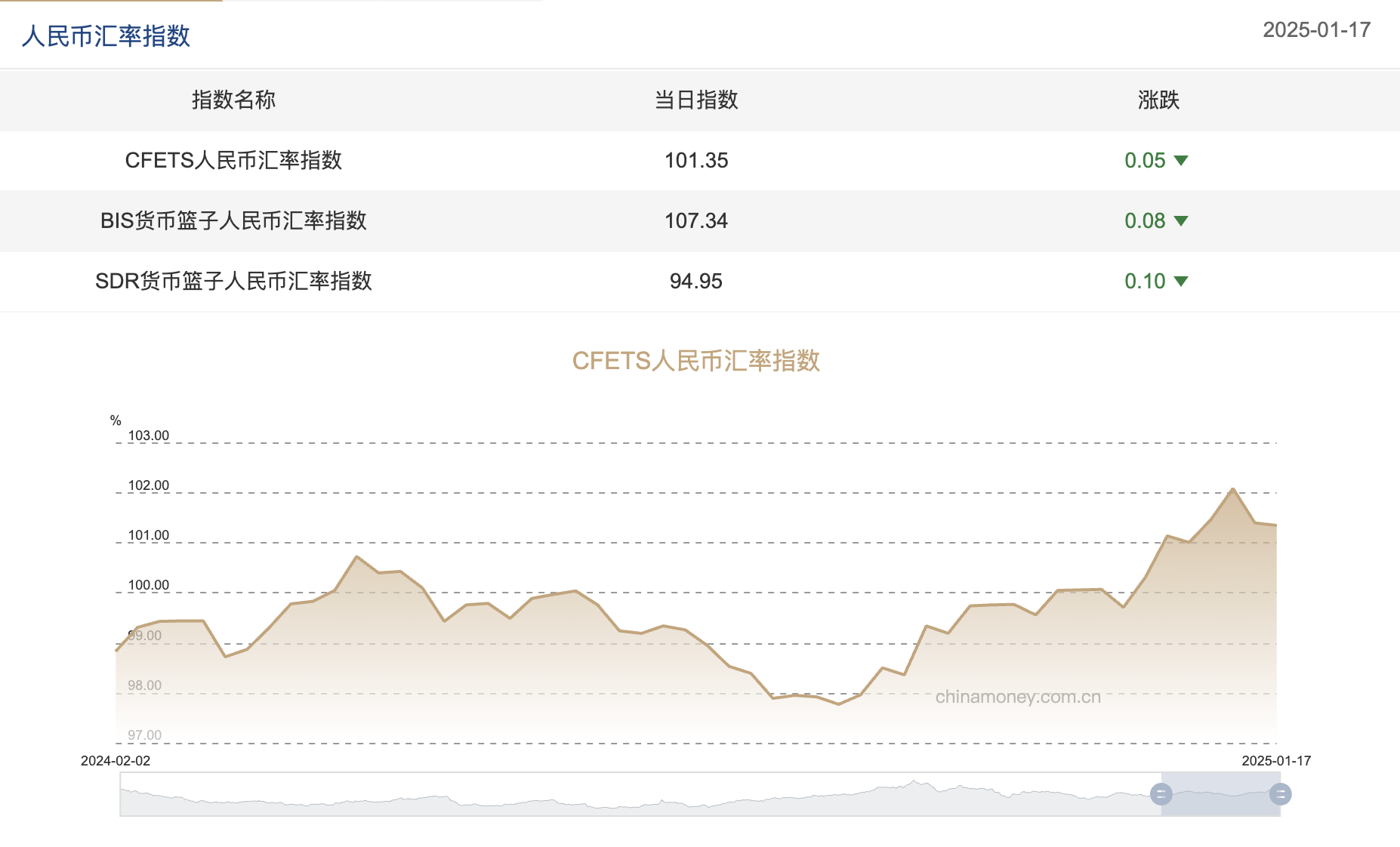 新华财经上海1月20日电(葛佳明)据中国外汇交易中心最新数据显示,1月17日当周,三大人民币汇率指数全线走低。具体而言,CFETS人民币汇率指数报收于101.35,较前一周下跌0.05;BIS货币篮子人民币汇率指数报107.34,周跌幅为0.08;SDR货币篮子人民币汇率指数则报收于94.95,周跌幅达到0.1。