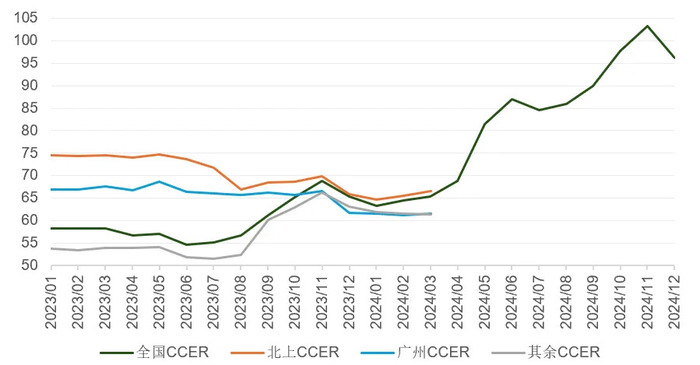 2024年是CCER全国统一交易市场启动的第一年,交易量达到1959.87万吨,同比上涨29%。复旦大学可持续发展研究中心公布的复旦CCER碳价指数显示,2024年CCER预期价格大幅上升,进入第四季度基本与全国碳配额价格持平,在100元/吨左右震荡。这一趋势变化显示出履约清缴抵消需求与存量CCER供应持续缩减对CCER价格的显著支撑作用。