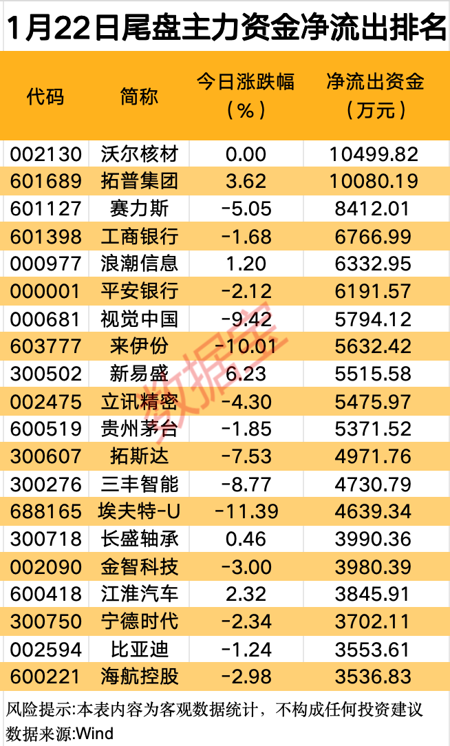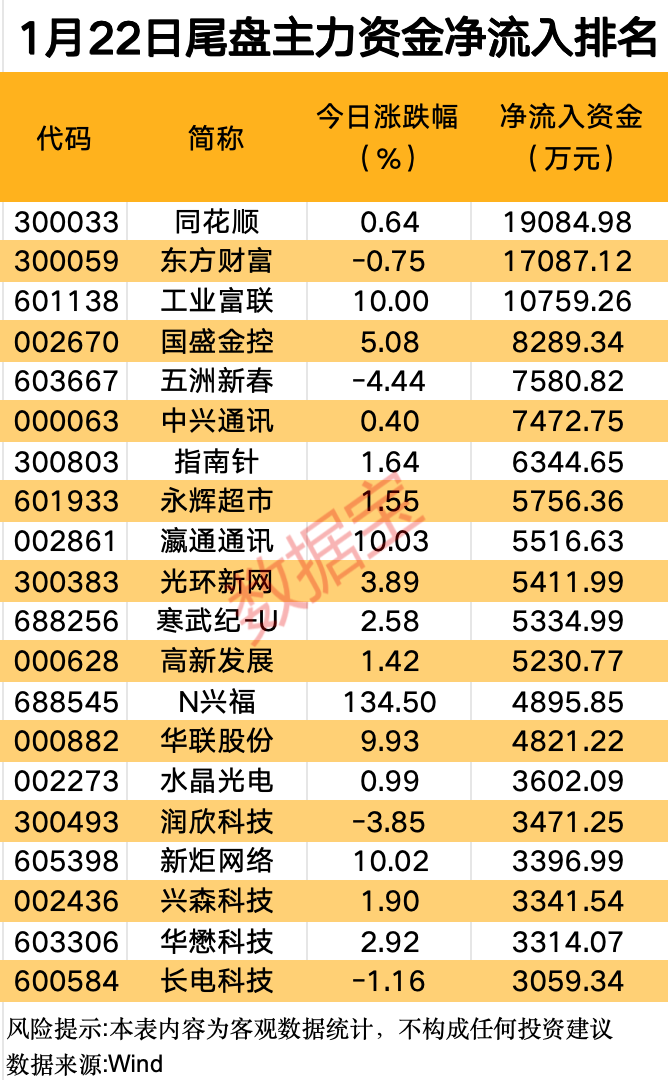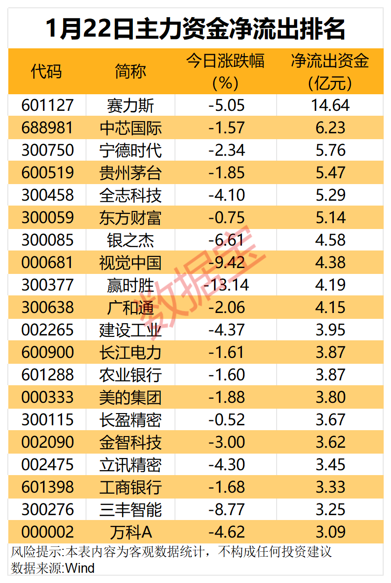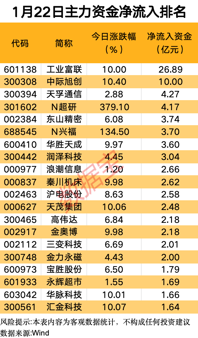 1月22日A股市场,通信行业成为唯一获主力资金净买入的行业,算力产业链持续强势,工业富联等个股涨停。尾盘非银金融行业获资金大幅回流,同花顺等金融科技股受青睐。同时,部分个股如赛力斯、中芯国际等净流出额居前。