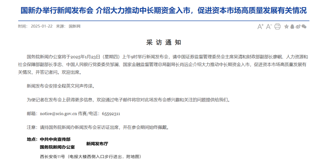 国务院新闻办将举行新闻发布会,介绍推动中长期资金入市、促进资本市场高质量发展的五大举措,包括提升商业保险资金A股投资比例、优化社保基金投资管理机制等。