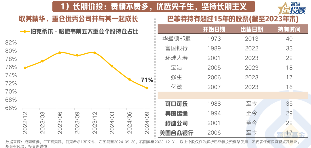 巴菲特深受恩师格雷厄姆影响,坚持寻找业务清晰、业绩持续、管理层卓越的大企业。其集中投资策略,正是自下而上精选个股理念的体现。历史数据显示,巴菲特持股数量虽少,但重仓股仓位高,长期持有并保持低换手率,重仓前五只股票中有三只持有时间超过20年。