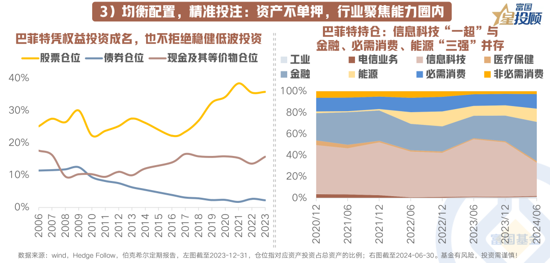 巴菲特不仅擅长权益投资,也注重类固收投资的配置。他根据市场环境调整资产配置比例,建议妻子将遗产投资于低成本标普500指数基金和短期政府债券。在股票投资中,巴菲特坚持选择自己能理解的企业,不断拓展能力圈,近年来大幅增配能源行业。