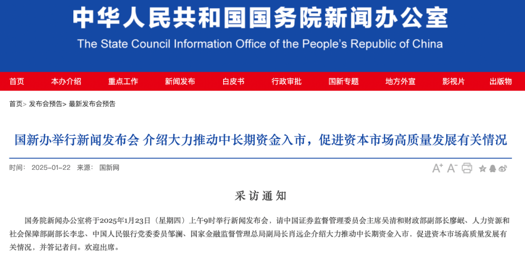国务院新闻办公室将于2025年1月23日召开新闻发布会,介绍大力推动中长期资金入市、促进资本市场高质量发展的相关情况,并答记者问。