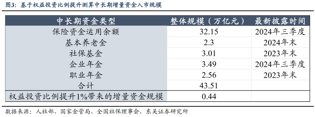 现状分析:当前A股市场中长期资金存在体量不足、投资“短视化”的问题。这一现状是“新国九条”重点任务之一,也是政治局会议、中央经济工作会议“稳住楼市”精神的延续。数据显示,截至2024年8月,我国机构投资者持有A股流通市值仅占22%,远低于美股市场2018年的50%水平。此外,险资、社保基金、养老金等权益投资比例偏低,占全部资产比重普遍不足20%,显示出我国中长期资金规模明显偏低。
