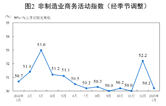 同期,中国非制造业商务活动指数为50.2%,较上月下降2.0个百分点,但仍高于临界点,表明非制造业总体保持扩张态势。其中,建筑业和服务业商务活动指数分别为49.3%和50.3%,显示出不同行业的扩张速度存在差异。