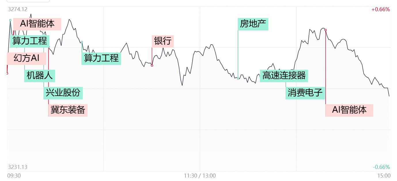 市场午后震荡走低,创业板指领跌。沪深两市成交额缩减,热点快速轮动,AI应用端活跃,银行股表现偏强。DeepSeek概念领涨,AI智能体概念继续活跃。个股总体跌多涨少,全市场超3400家个股下跌。银行股逆势上涨,多家上市银行发布业绩快报,净利润正增长。市场风险偏好下降,银行和农业防御性板块受青睐。