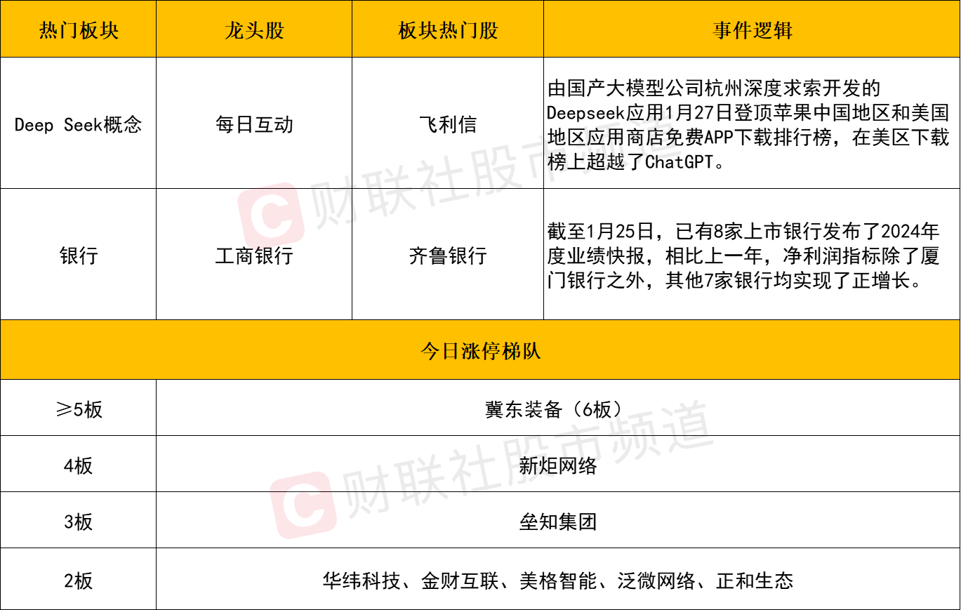 财联社1月27日讯,午后市场震荡下行,创业板指领跌,沪深两市成交额缩减至1.12万亿,较前一日减少1041亿。盘面热点快速更迭,AI应用端表现相对亮眼,红利股如银行等亦表现强劲。个股方面,全市场超3400家个股下跌,其中逾百股跌幅超过9%。板块上,Deepseek概念异军突起,每日互动、航锦科技、美格智能等多股涨停;AI智能体概念同样保持活跃,新炬网络、视觉中国等多股涨停。而算力硬件股则全面回调,沃尔核材等个股跌停;机器人概念亦出现回调,金奥博、中坚科技等个股跌停。截至收盘,沪指微跌0.06%,深成指下跌1.33%,创业板指大幅下跌2.73%。