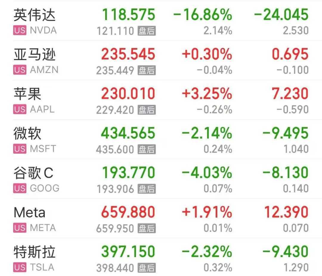 截至收盘,道指微涨0.65%,但标普500指数和纳指分别下跌1.46%和3.07%,纳指更是重挫超600点。其中,谷歌、特斯拉及微软等科技巨头也纷纷下跌,而亚马逊、Meta及苹果则逆势上涨。