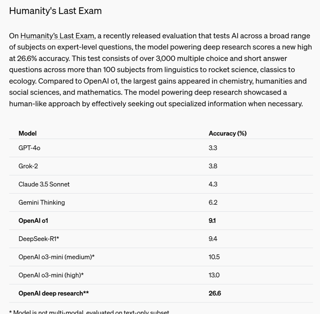 在测试中,OpenAI使用“人类最后的考试”对ChatGPT深度研究进行了评估,该测试包含3000多个各学术领域的专家级问题。结果显示,深度研究所使用的o3模型在该评估中取得了26.6%的准确率,显著优于其他模型。