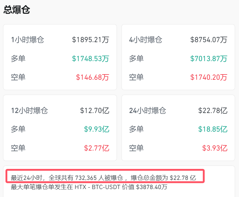 截至晚上21时40分左右,比特币跌幅仍超过4%,价格徘徊在9.48万美元附近;以太坊跌势未减,跌幅超过16%;艾达币、Avalanche等加密货币也纷纷走低,跌幅均超过19%。此外,Coinglass数据还显示,在24小时内,加密货币全网爆仓金额已达到22.78亿美元,其中多单爆仓金额高达18.85亿美元。