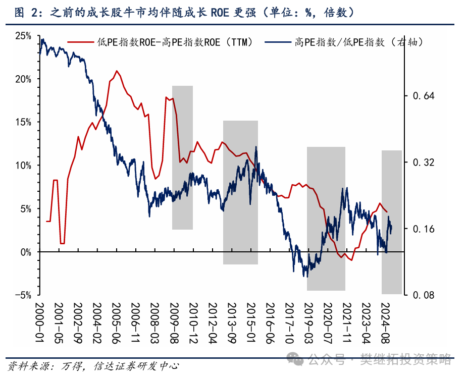 历史数据显示,成长股牛市(如2009-2010年、2013-2015年、2019-2021年)期间,成长股的ROE表现更为强劲。尽管历史上也曾出现过不依赖利润兑现的成长股牛市(如2000年、2015年上半年),但这些牛市持续时间相对较短。